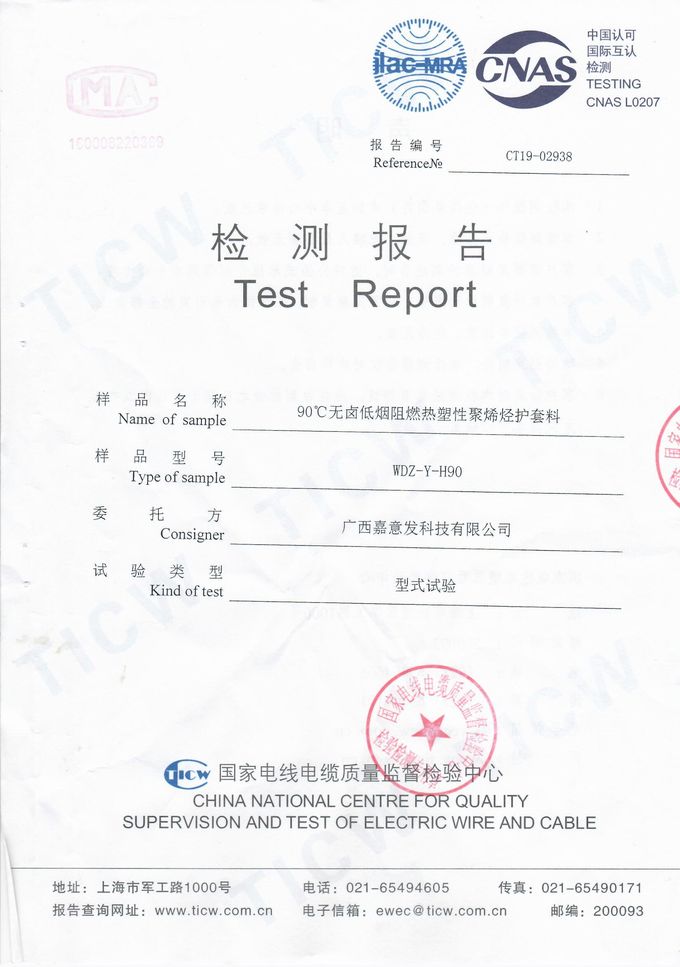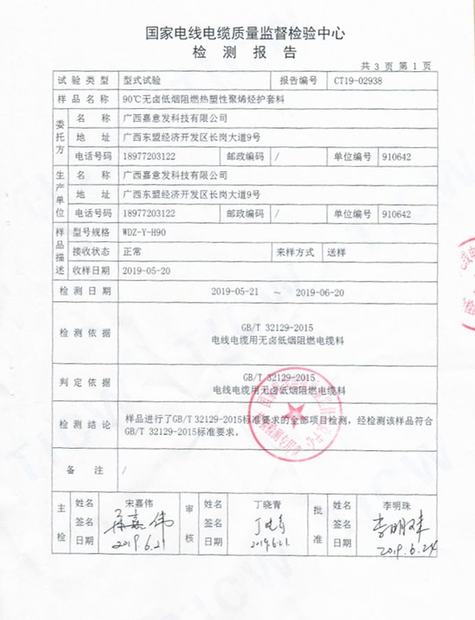 90℃低煙無鹵阻燃熱塑性聚烯烴護套料試驗報告